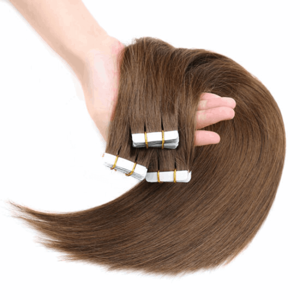 Tape in hair extensions come with pre-taped wefts made of a medical-grade adhesive and are usually one inch wide. Similar to other type of hair extensions, tape-ins can be made of real human and Remy hair or synthetic hair.